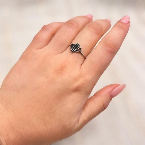 ANEL CORAÇÃO LISO RESINADO PRETO PRATA 925